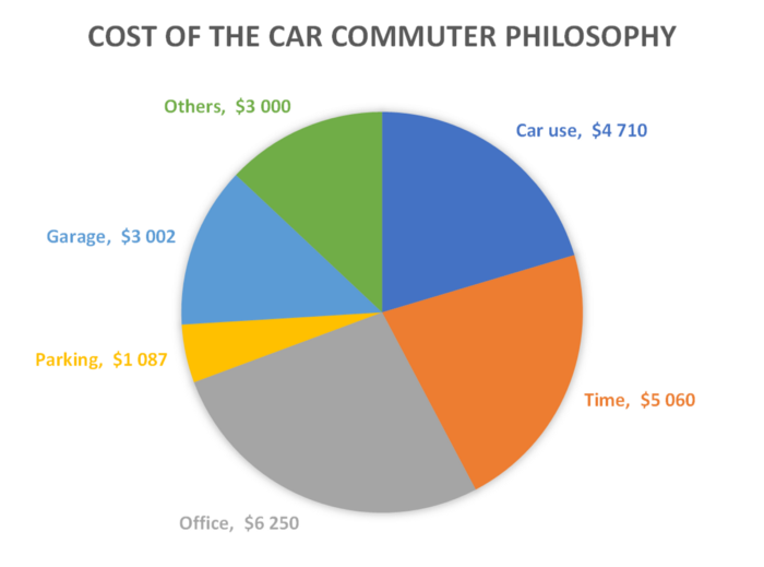 The first of these niches is the suburban commuter, where a BEV with a relatively small battery pack is a compelling solution (especially for two-car families). I updated my earlier estimate of the total societal costs of the car commuter philosophy and arrived at a whopping $23,100/year (see below). This is about half the average wage of rich-world citizens. If we assume a worker creates about twice as much value as his salary, it means that about a quarter of the value created by the average commuter is instantly destroyed by the (stressful and frustrating) model of getting to work.